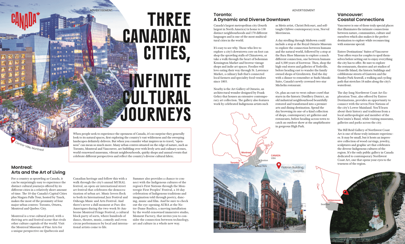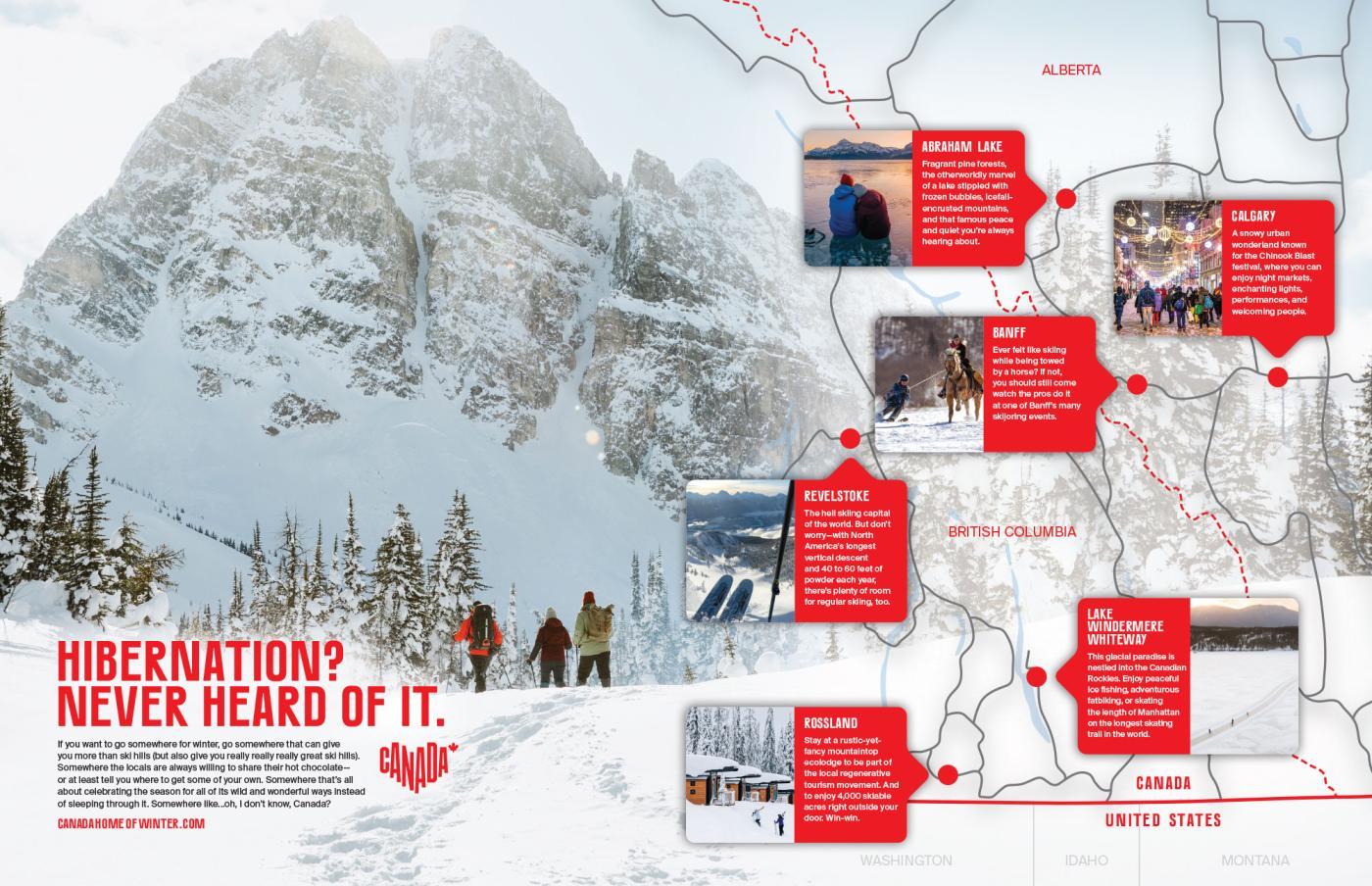 Journeys Through our use of journey-based print ads, we've taken an innovative approach to showcasing how Canada’s extraordinary openness will refresh Americans’ perspectives and enrich their lives. By teasing out uniquely Canadian destinations and points of interest dotted on a map, these journey-based ads are intended to increase our audience's awareness of Canada and inspire them to prioritize travelling to Canada. We want them to experience first-hand our wide open landscapes, iconic, vibrant cities, and diverse cultures and communities.